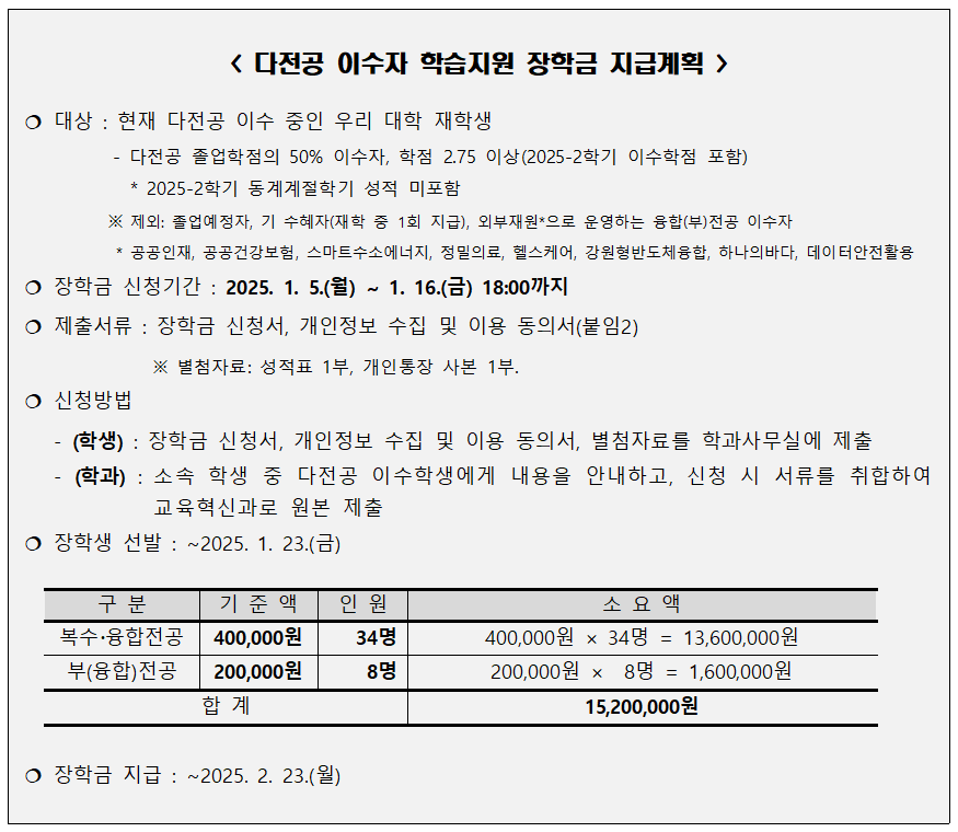[학부] 2025학년도 다전공 이수자 학습지원 장학금 지급 계획 알림