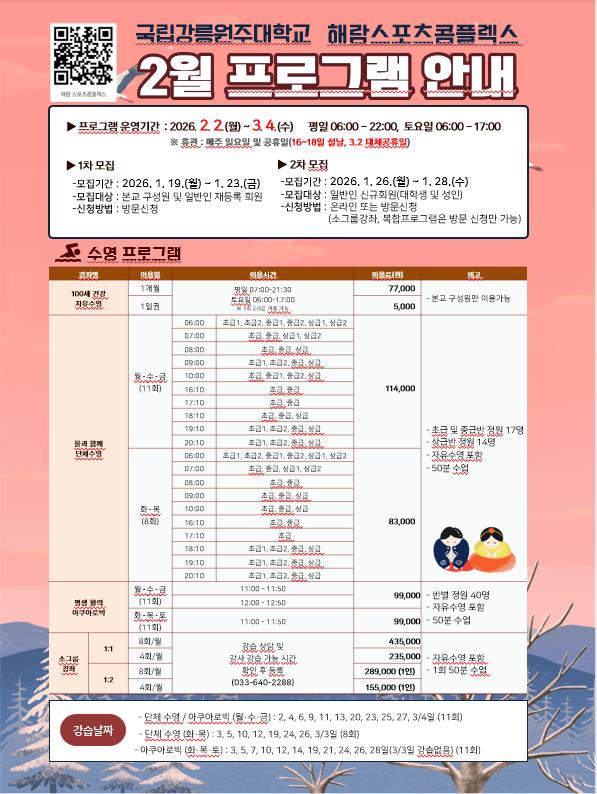 해람 스포츠콤플렉스 2026. 2월 프로그램 회원 모집 안내