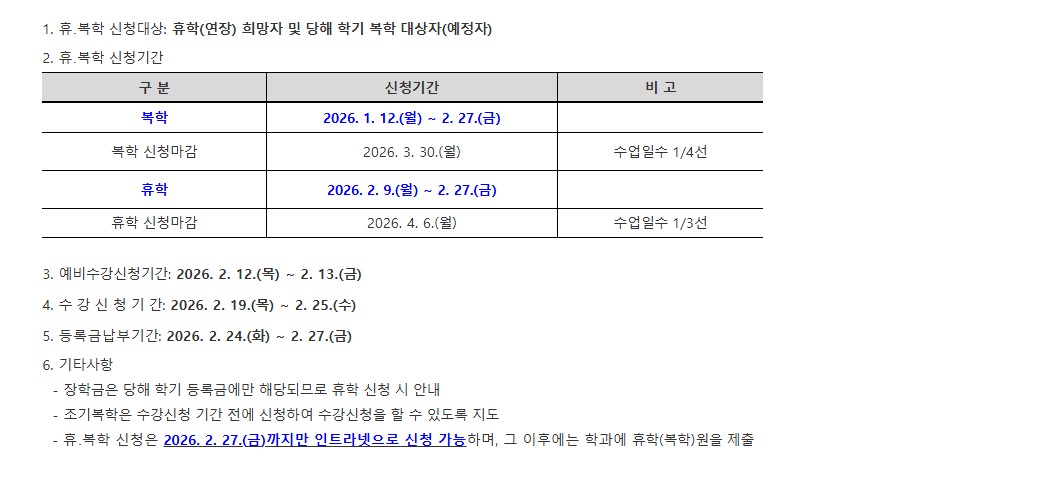 2026학년도 1학기 휴학,복학 신청 안내