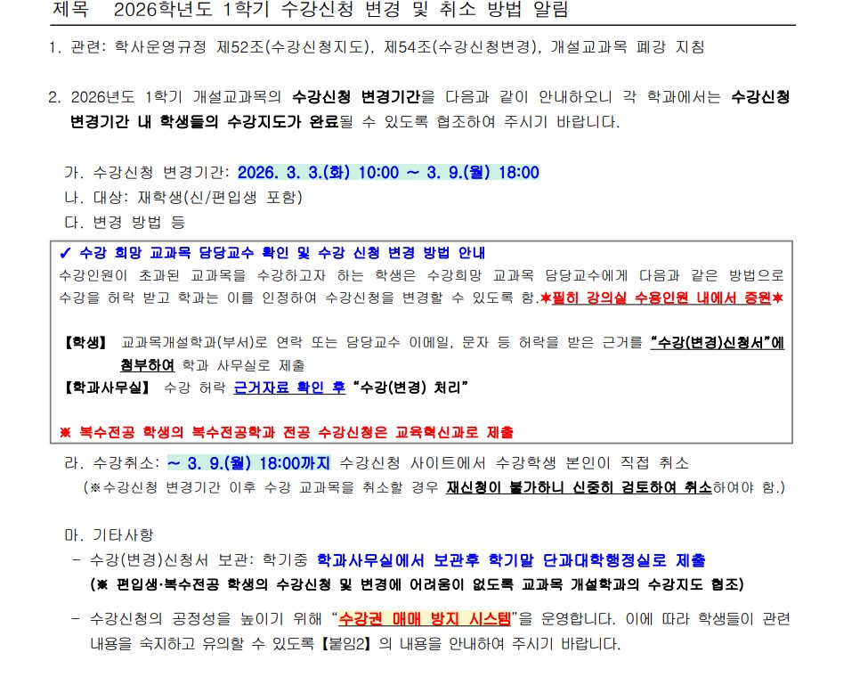 2026학년도 1학기 수강신청 변경 및 취소 방법 알림