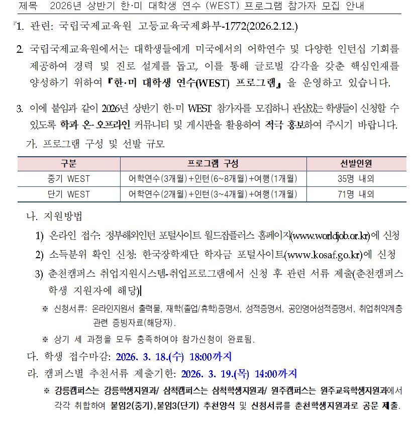 2026년 상반기 한·미 대학생 연수 (WEST) 프로그램 참가자 모집 안내
